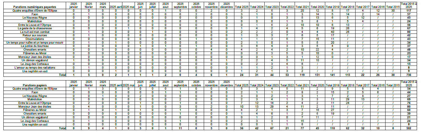 En attendant, je vous mets ci-dessous un bilan des ventes papier et numérique de l'année 2023. Si on compare à l'année 2022, l'année aura été plutôt bonne pour les ventes des livres en version papier. Cette hausse est essentiellement due à la présence de Kevin Kiffer en festival qui a vraiment très très bien vendu.