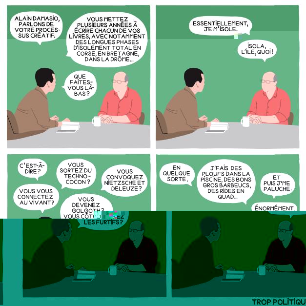 Quelqu'un, dans son entourage, va-t-il enfin lui hurler dans les oreilles que c'est un gros romancier de la droite bourgeoise doublé d'un parasite qui bouffe à tous les râteliers, ou est-ce que ses copains sont aussi déphasés que lui ?