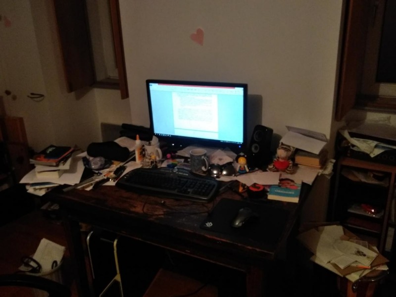 Quand j'écris sur PC, mon bureau en bordel avec dictionnaire de synonymes, deux trois papiers en retard que je ferais le lendemain (me dis-je), un bouquin ou deux d'Histoire, tasse de café plus ou moins froid, etc...