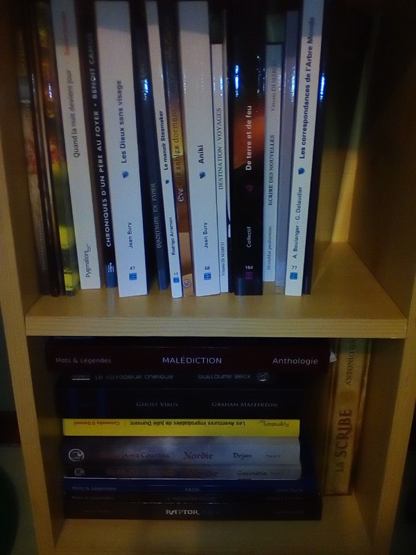 Je ne lis vraiment que depuis 2015 à peu près. J'ai donc juste une table de chevet (presque pleine) des livres que j'ai lus ou à lire. De plus, budget serré = pas mal d'ebook. Les papiers, c'est pour ceux qui me font carrément de l’œil. Il m'en manque quelques uns que j'ai prêtés.