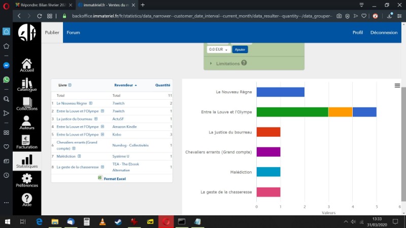 Kaliom Ludo wrote: J'espère qu'on va s'implanter sur Youboox, car ce serait un gros avantage pour la visibilité. L'anthologie "Ombres" a l'air d'arriver à conserver sa place et on ne pourrait rêver mieux pour CE. Reste que je n'ai pas les données en temps réel pour Youboox, donc on verra ce que ça donne vraiment le mois prochain.