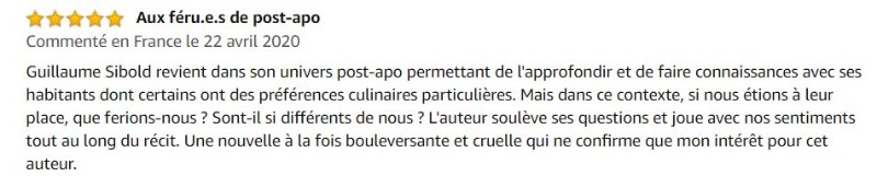 ça semble le cas : www.amazon.fr/gp/customer-reviews/R1IJAO...UTF8&ASIN=B07JYR5Z6RAsavar wrote: Une super critique que j'ai eu plaisir à lire. Et je remercie la personne qui l'a écrite et espère rester à la hauteur de ses attentes pour le futur.