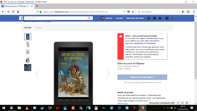 Résultat : rien ne fonctionne correctement, Facebook a bloqué la plupart des titres sur lesquels j'ai modifié les prix. J'ai pas des raisons pour tout, mais je joins la raison pour "Faon"... Ce serait drôle, si ça foutait pas un bordel monstre dans ce que j'avais prévu.